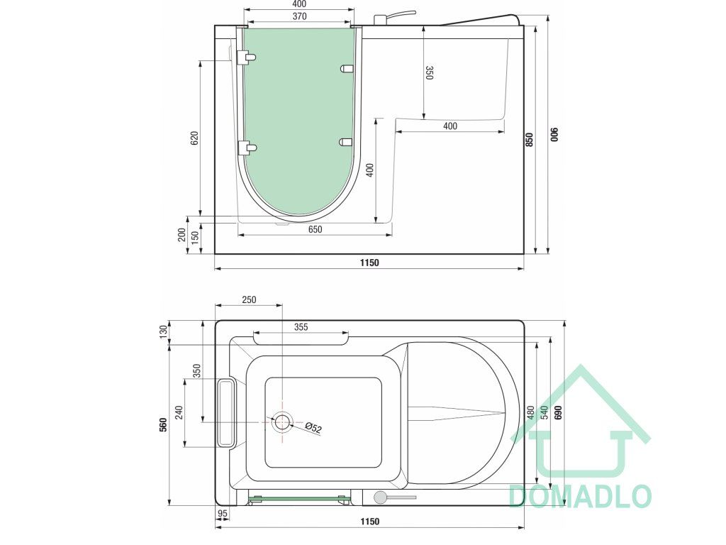 technický nákres:vana s dvirky-leva-medica-h5621-115-l-115x69x90