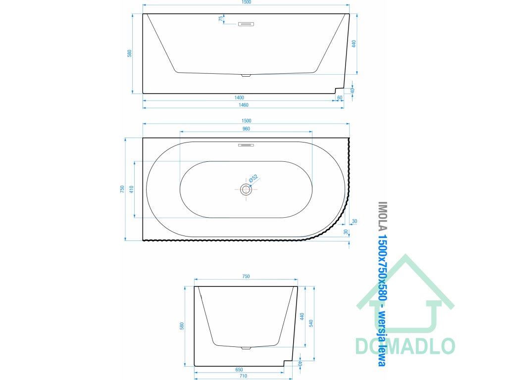 V naší nabídce najdete také identický model o rozměrech 150 x 75 v levém provedení a také stejný model volně stojící vany IMOLA o rozměrech 170 x 78 cm v levostranném i pravostranném provedení.