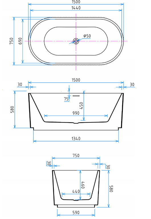 - vanový sifon uprostřed je součástí balení (zakončení trubky sifonu o průměru 50 mm)