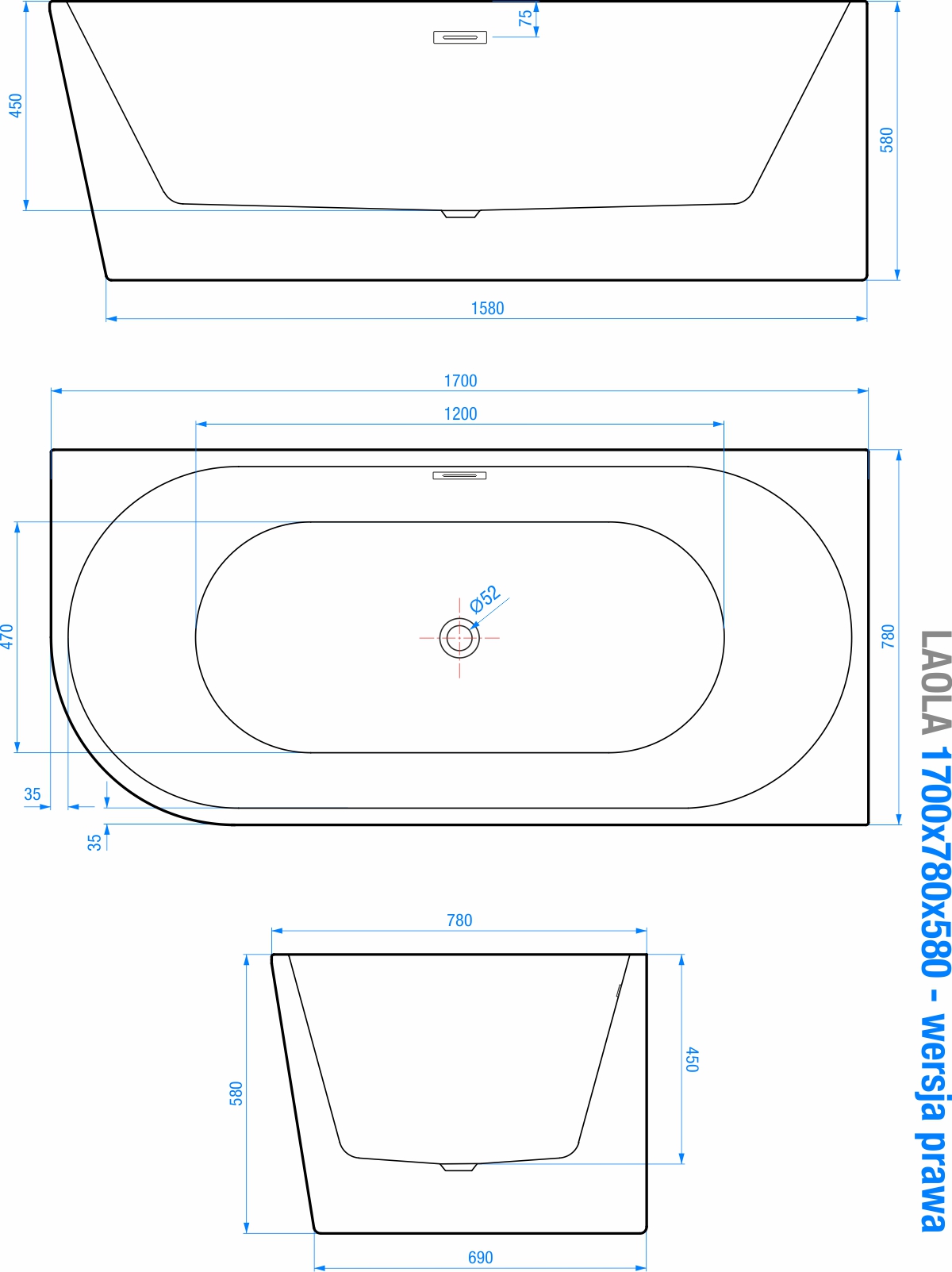 V naší nabídce najdete také vedle rozměru 170 x 78 v pravém provedení také stejný model volně stojící vany LAOLA o rozměrech 150 x 78 cm, 180 x 78 cm v levostranném i pravostranném provedení.